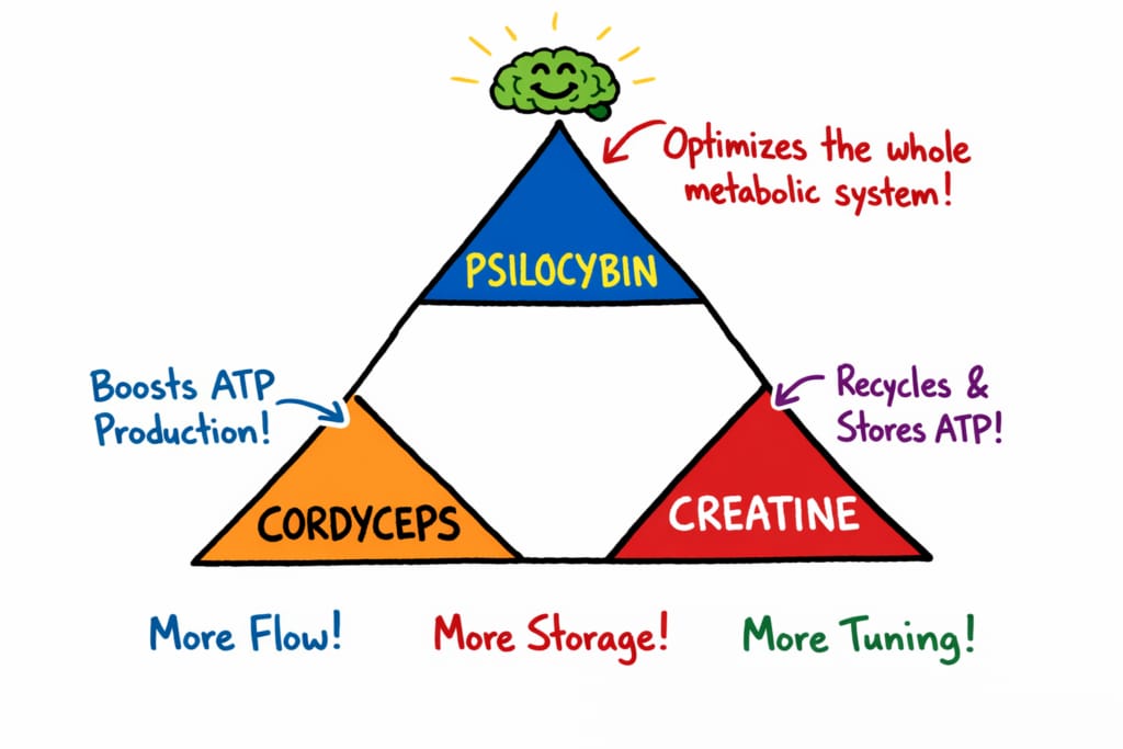 While creatine works at the end of the energy chain (recycling ATP), cordyceps works at the beginning by improving how your mitochondria actually produce ATP in the first place.